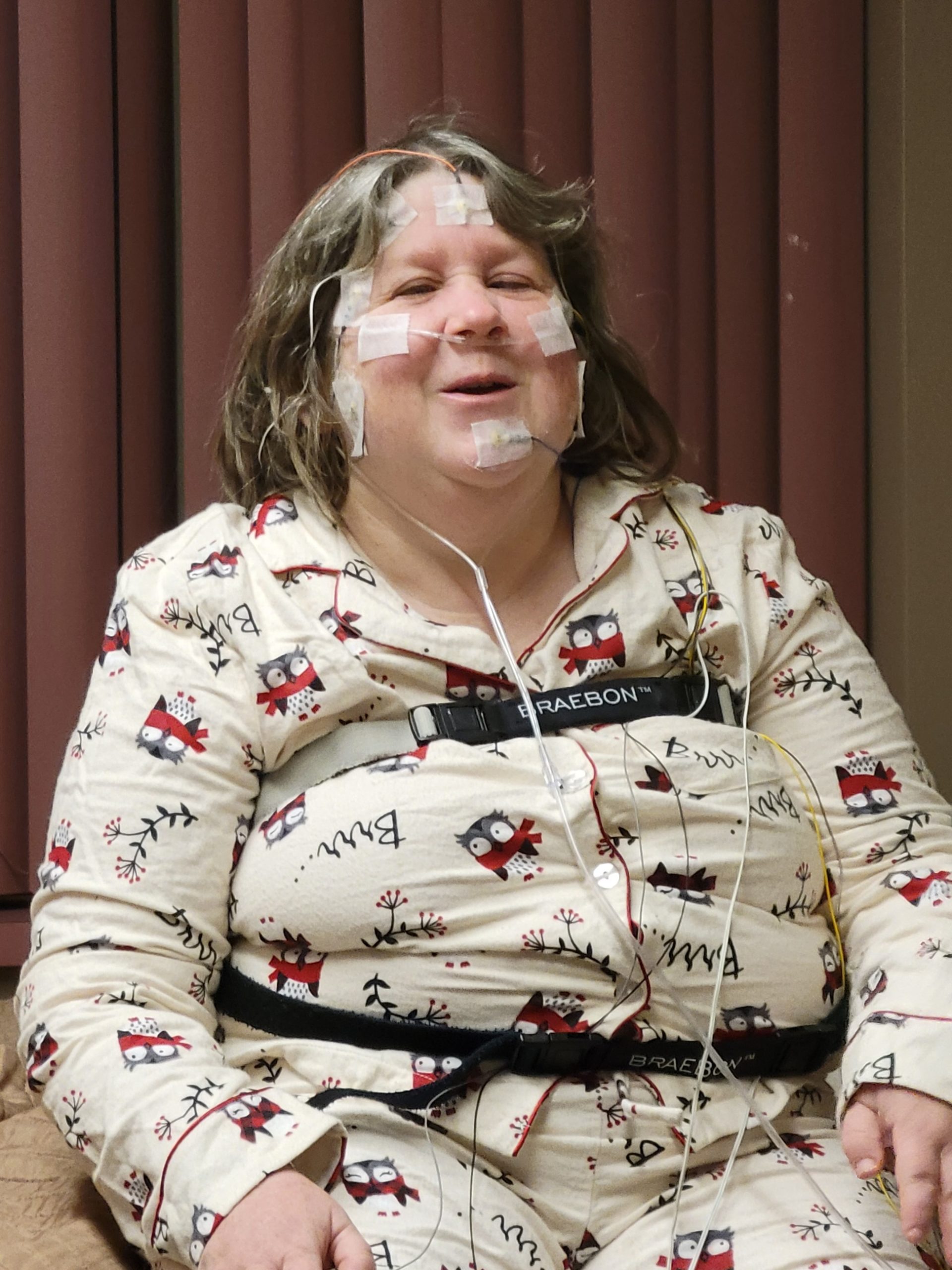Me sitting in my pajamas with a zillion leads connected to my face, head and chest.