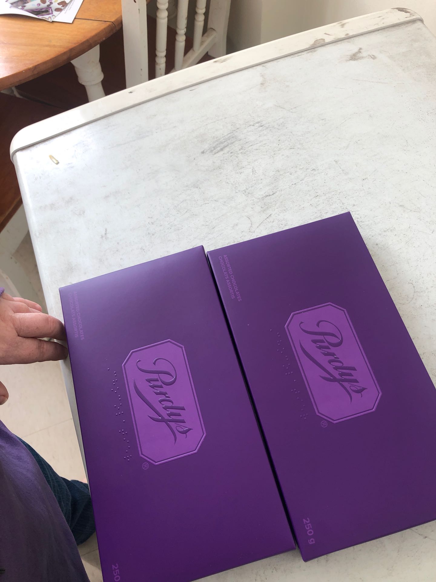 They’re pretty cool. On the outside is Braille down the sides that says “Feel the joy.” Har har that’s cute. Then it says “Chocolatier” across the front, below the Purdy’s logo. Then you open it up, and the Braille legend is so cool! You know which way is up because they made sure the legend is facing the same way as the chocolates, so you have to make sure you put it back the right way. It’s really well done. The braille for each chocolate is surrounded by these little lines, so you can tell what goes where. And, on the other side is a QR code you can scan so that you can read all about the chocolates, in detail that they couldn’t hope to put in the braille sheet.